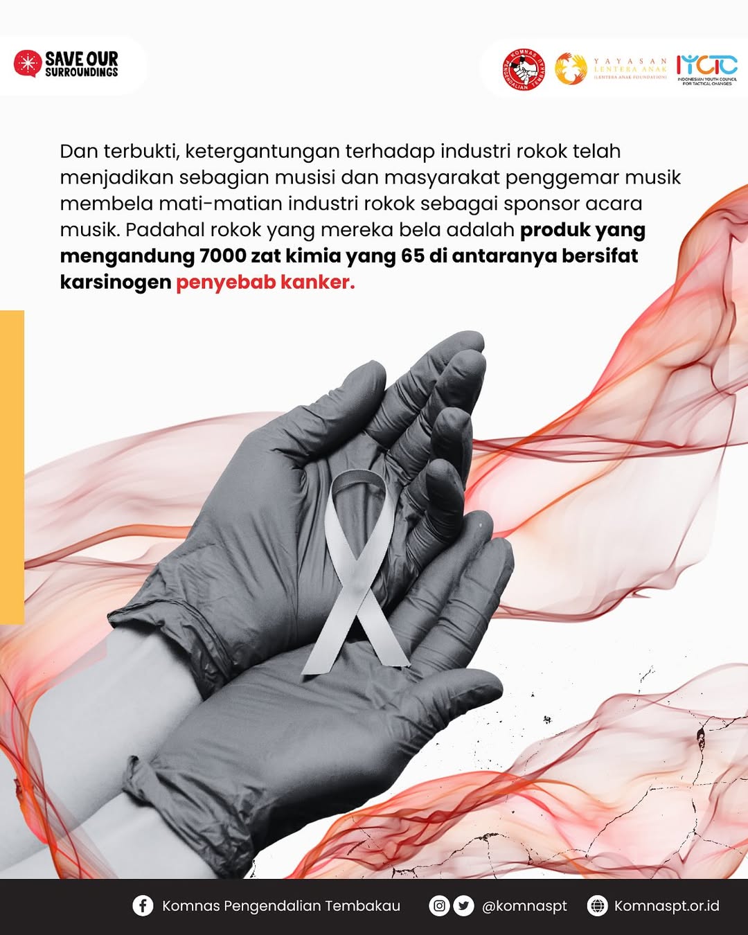 The cigarette industry continues to create dependence on sponsorship in the Indonesian music industry by funding concerts for decades. This dependence makes some musicians and fans fiercely defend the industry, despite the 7,000 chemicals—65 of them carcinogenic—contained in the cigarettes they promote.